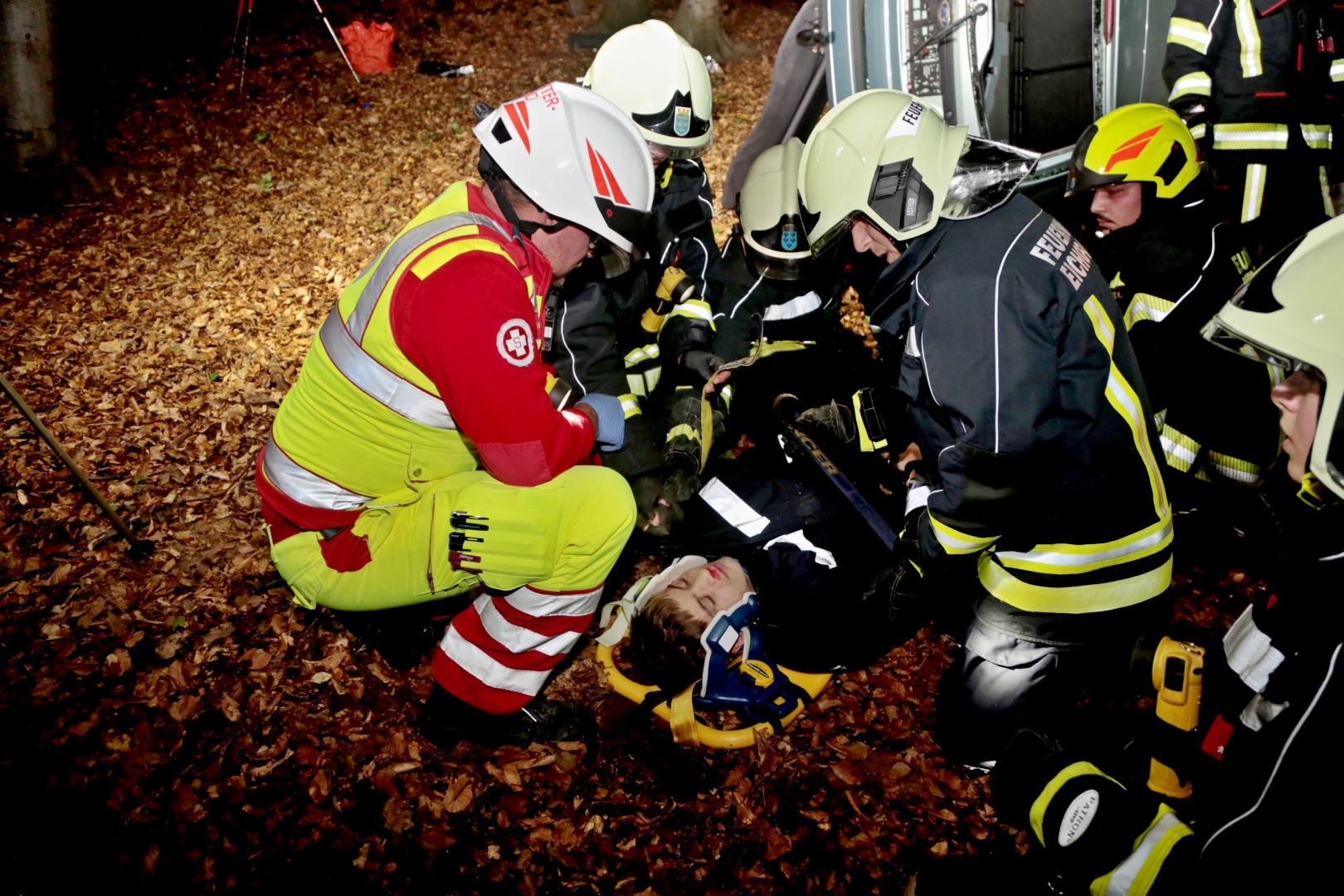 Sobald die Bekämpfung des Waldbrandes eingeleitet wurde, konnte der Einsatzleiter bis zum Wrack vordringen und die Menschenrettung anordnen. Die Opfer mussten stabilisiert und teilweise aus dem Wrack geschnitten werden. Alle Verunfallten wurden aus der Gefahrenzone gebracht und der Rettung übergeben, welche die Triage und Erstversorgung durchgeführten und die Unfallopfer abtransportierten.
