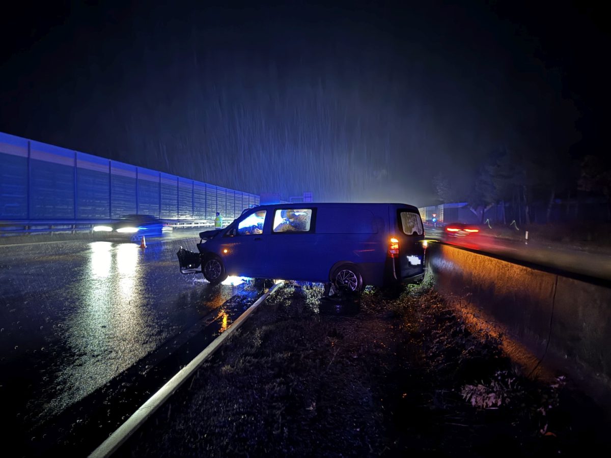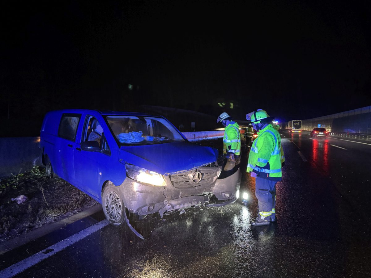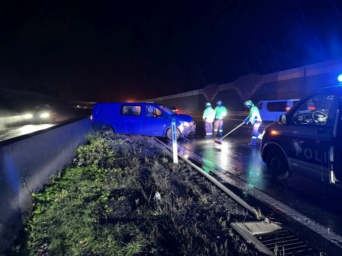 Ein PKW war auf der regennassen Fahrbahn ins Schleudern geraten und prallte gegen die Fahrbahnbegrenzung. Entgegen der ersten Meldung war keine Person im Fahrzeug eingeklemmt.