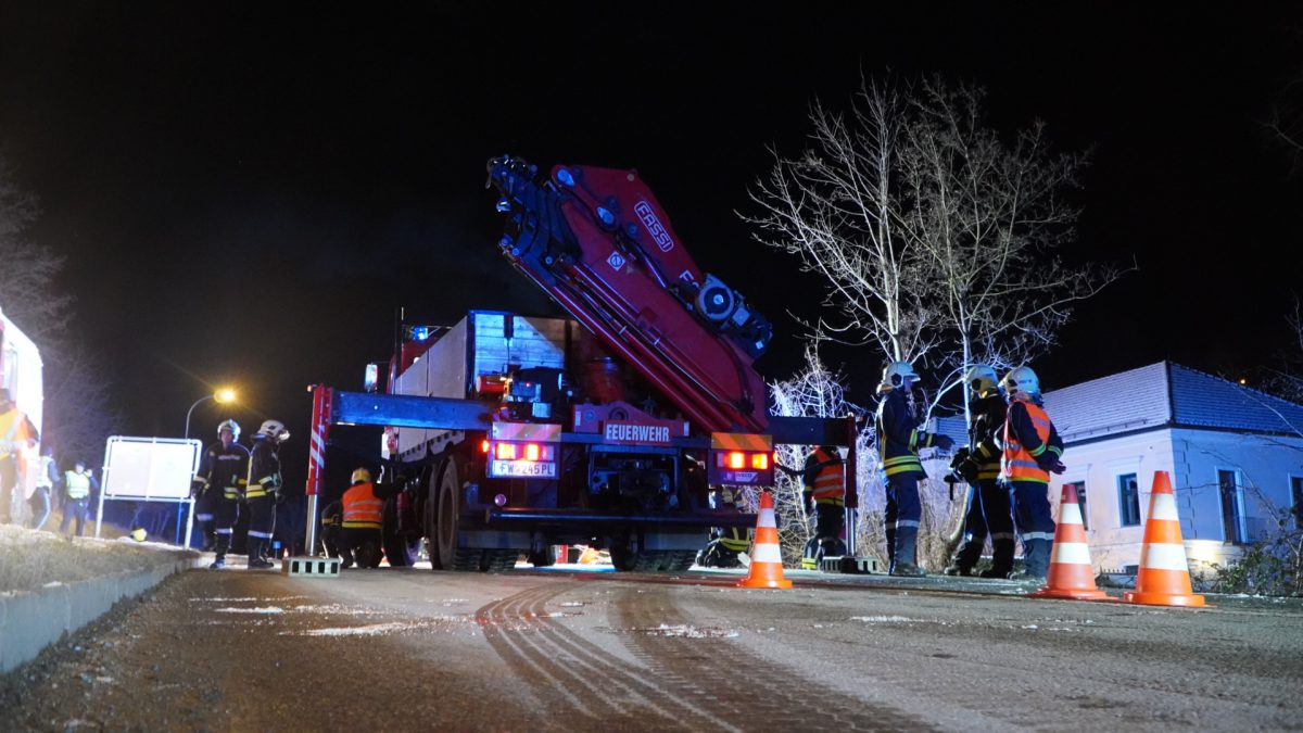 Anschließend wurde die Fahrzeugbergung mit dem Kran des Lastfahrzeuges der FF Eichgraben durchgeführt. Während der Bergungsarbeiten musste die Straße vorübergehend von der Polizei gesperrt werden. Nach Abschluss der Bergung wurde der PKW gesichert auf einem Parkplatz abgestellt.