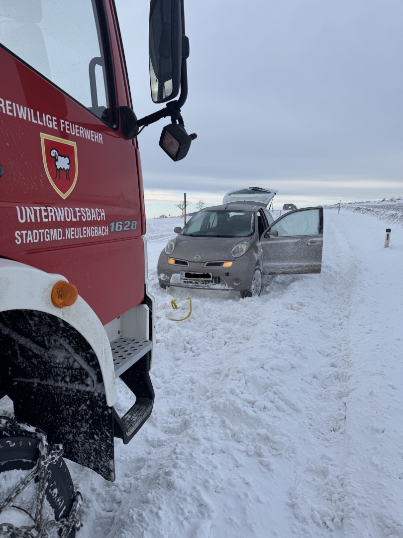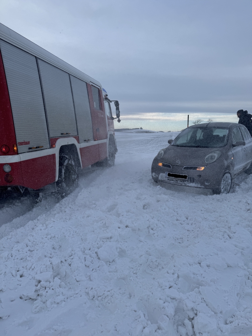 Bereits am Vortag musste ein Fahrzeug aus dem verwehten Straßenabschnitt geborgen werden. Auch am heutigen Tag (11.01.2026) führte eine Erkundungsfahrt über den Saugraben zu einem weiteren Einsatz: Auf dem Rückweg wurde ein festgefahrenes Fahrzeug entdeckt und umgehend geborgen.