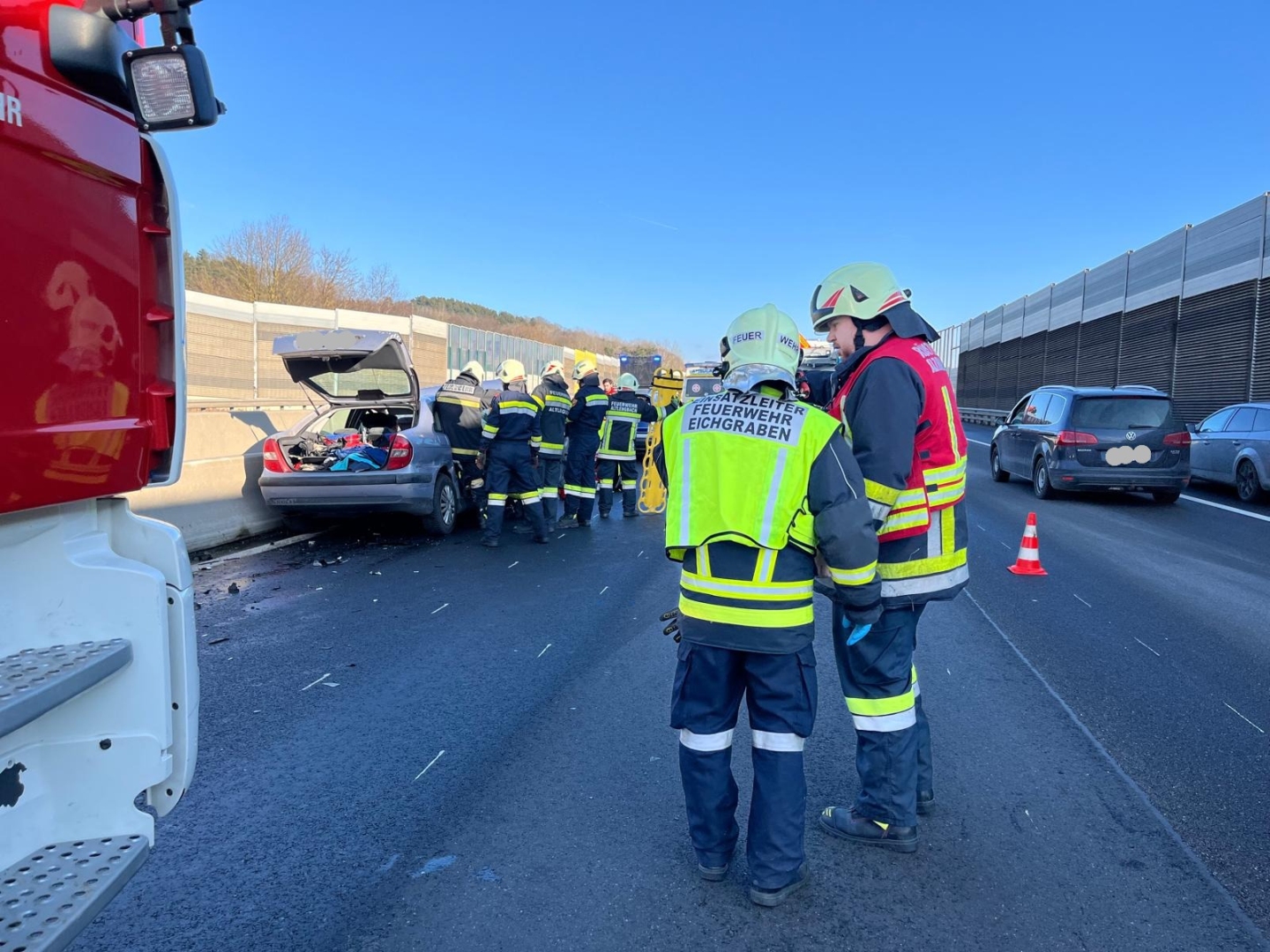 Beim Eintreffen der ersten Feuerwehrkräfte stellte sich heraus, dass ein Pkw aus bislang ungeklärter Ursache rechts von der Fahrbahn abgekommen war und im Bereich einer Pannenbucht gegen die Leitschiene prallte. In weiterer Folge wurde das Fahrzeug durch die Wucht des Aufpralls zurück auf die Fahrbahn geschleudert und kollidierte mit der Mittelbetonwand. Zwei Personen befanden sich im stark beschädigten Fahrzeug.