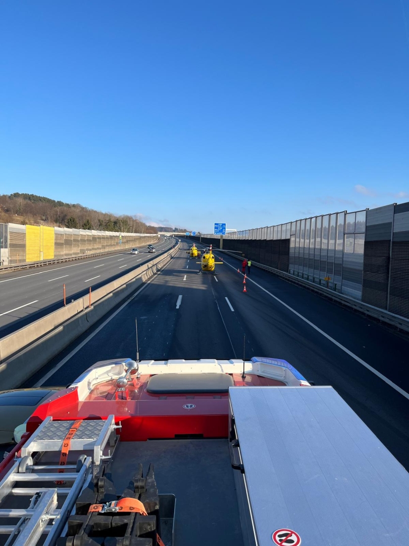Parallel dazu wurden umfassende Absicherungsmaßnahmen auf der Autobahn gesetzt sowie der Brandschutz sichergestellt. Nach der notärztlichen Versorgung vor Ort wurden beide verletzten Personen mit den Notarzthubschraubern Christophorus C2 und C9 in umliegende Krankenhäuser geflogen.