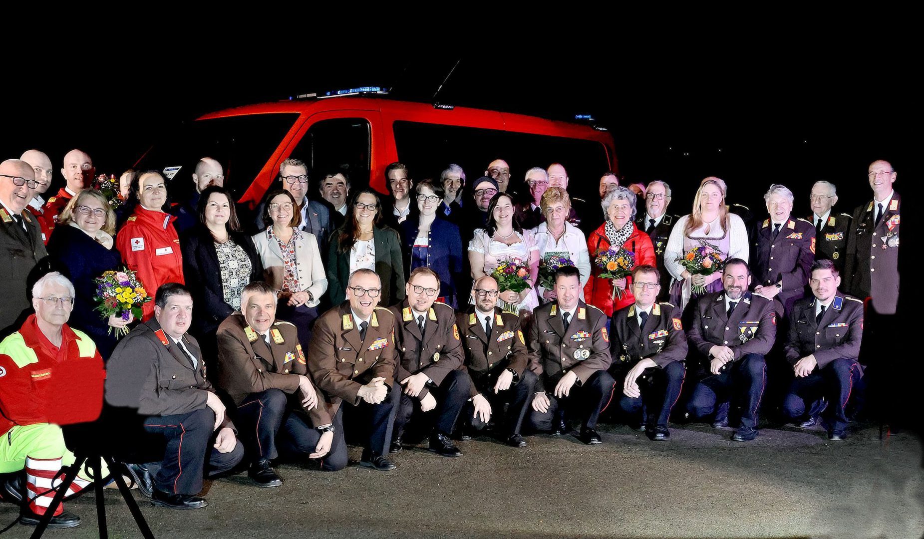 Nach einem Rückblick und der einen oder anderen Ansprache fand die Präsentation des neuen Kommandofahrzeuges im Rahmen einer Show mit Licht- und Raucheffekten statt. Dazu hatte man sich ein Drehbuch überlegt und ließ das neue Einsatzfahrzeug mittels Hubschrauber einfliegen.